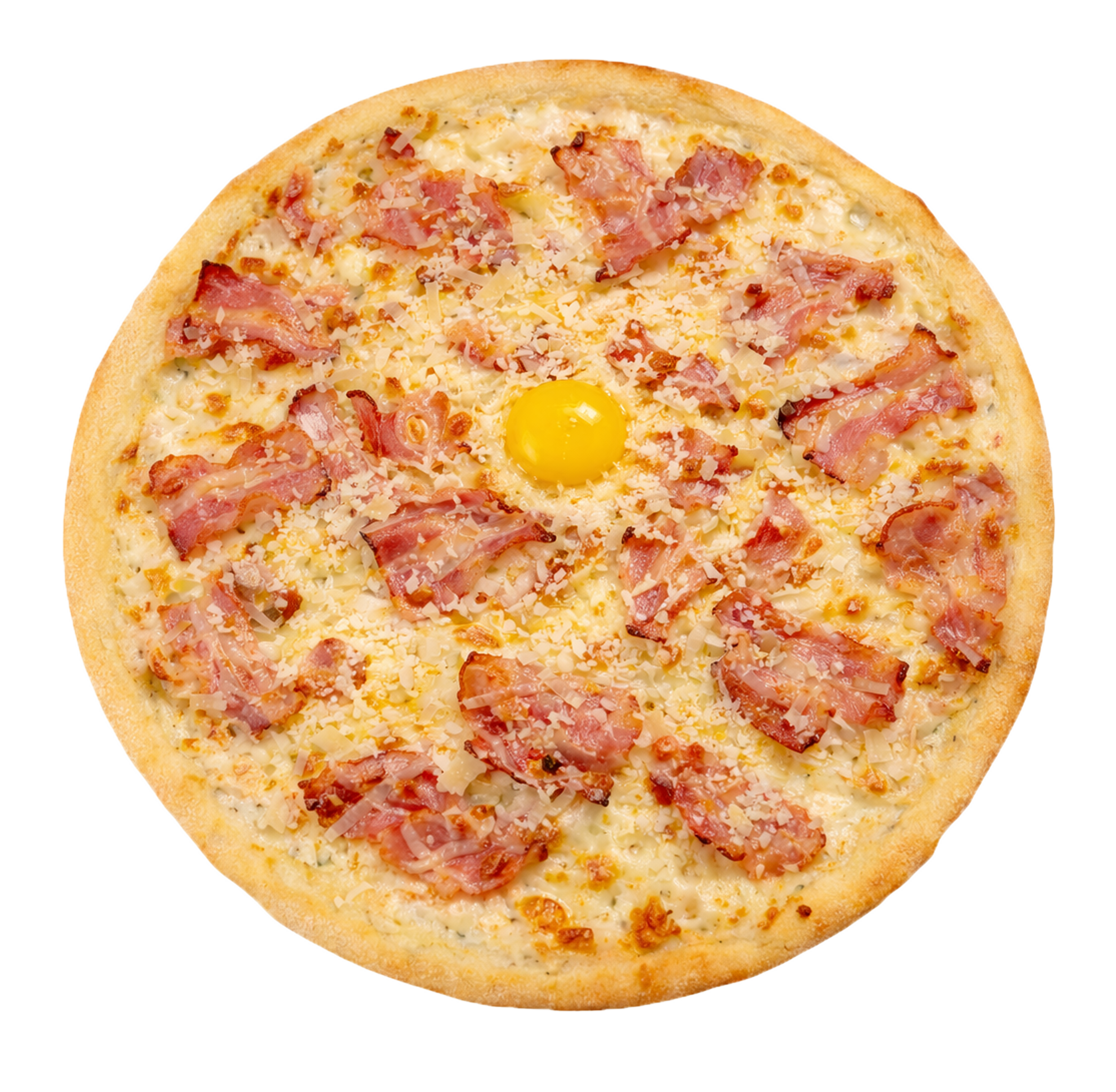 Соус вершковий, моцарела, бекон, жовток, пармезан