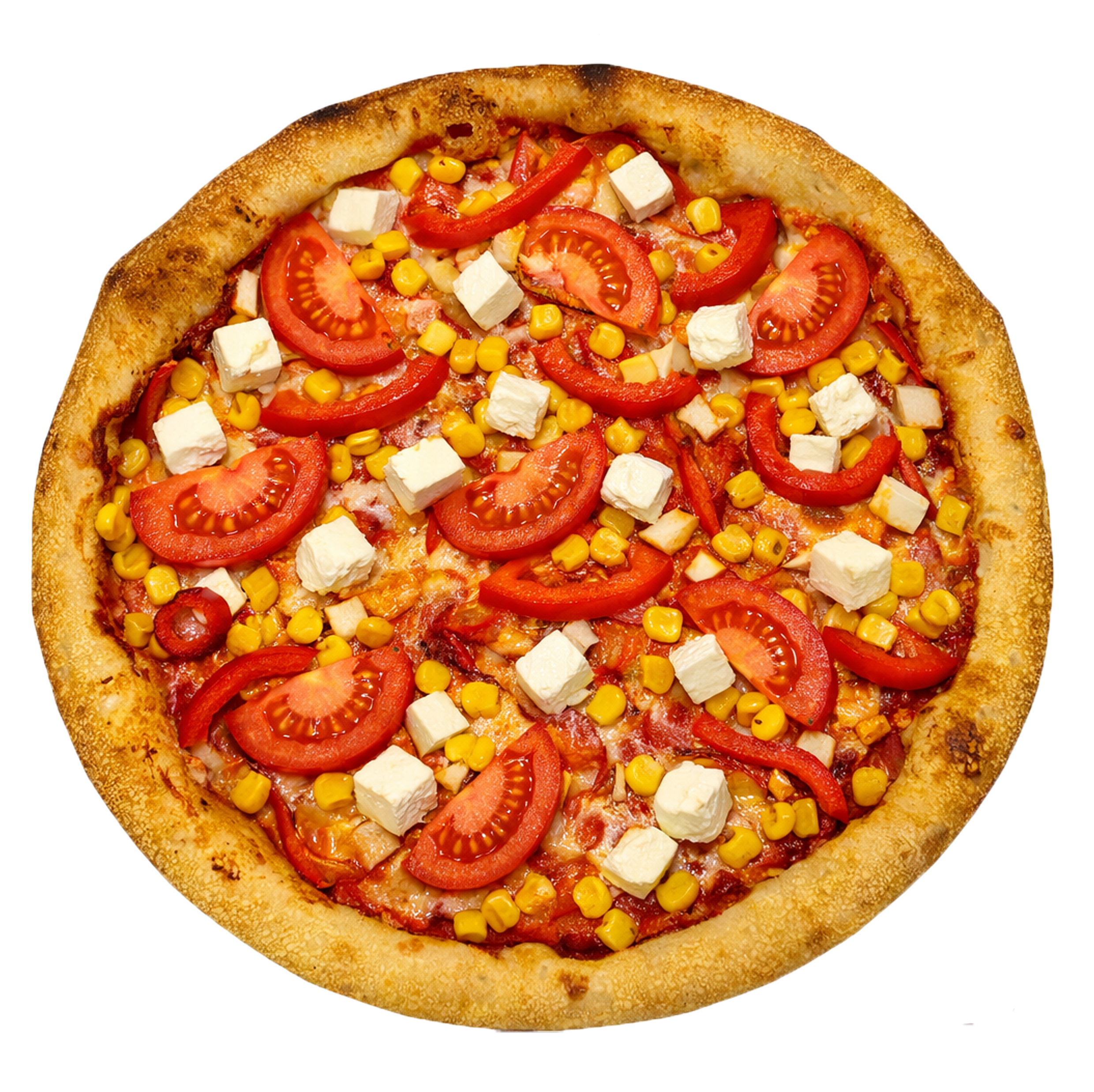 Соус томатний, моцарела, помідор, болгарський перець, кукурудза, фета
