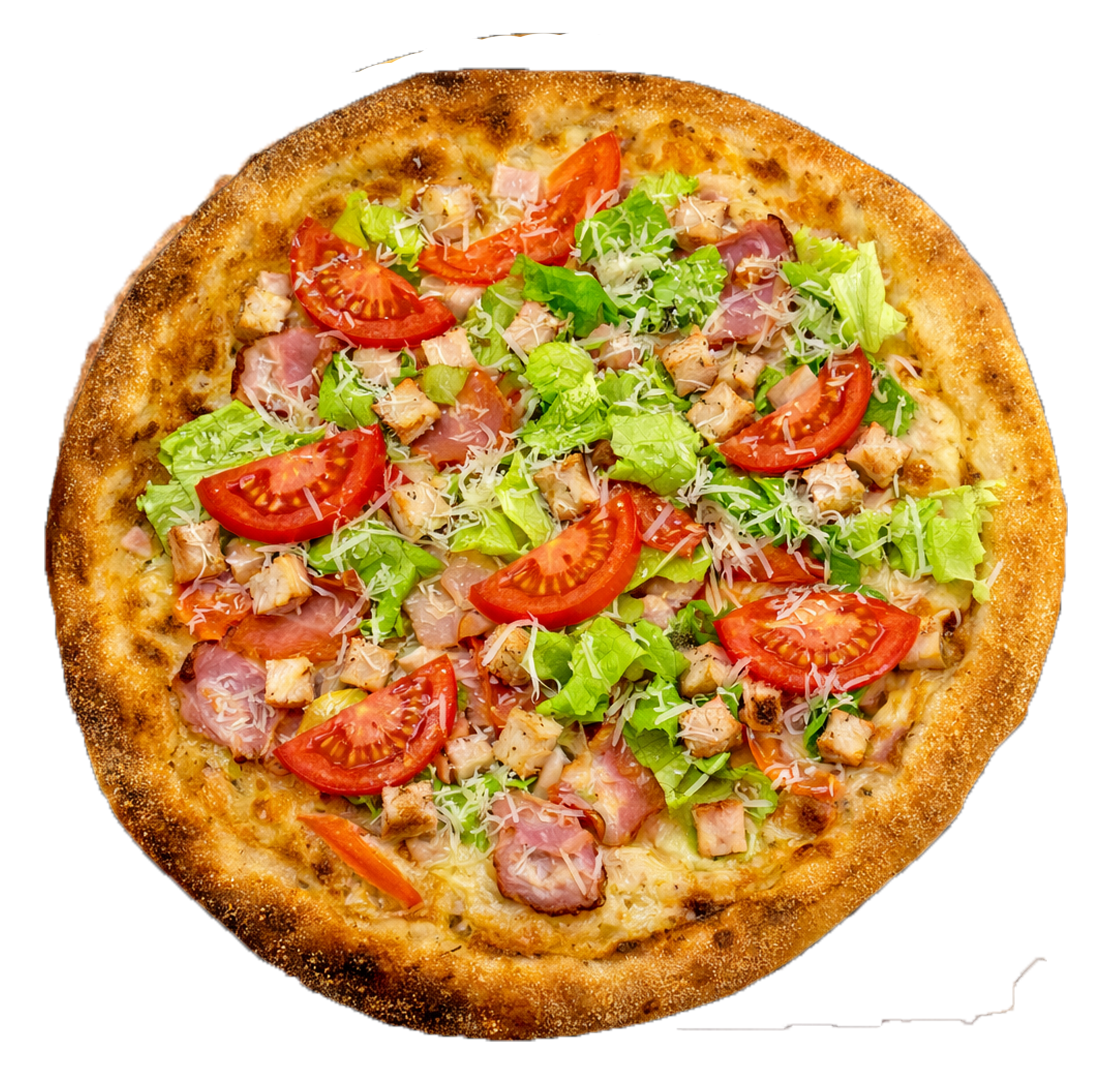 Соус цезар, моцарела, копчена курка, бекон, салат Айсберг, пармезан, помідор