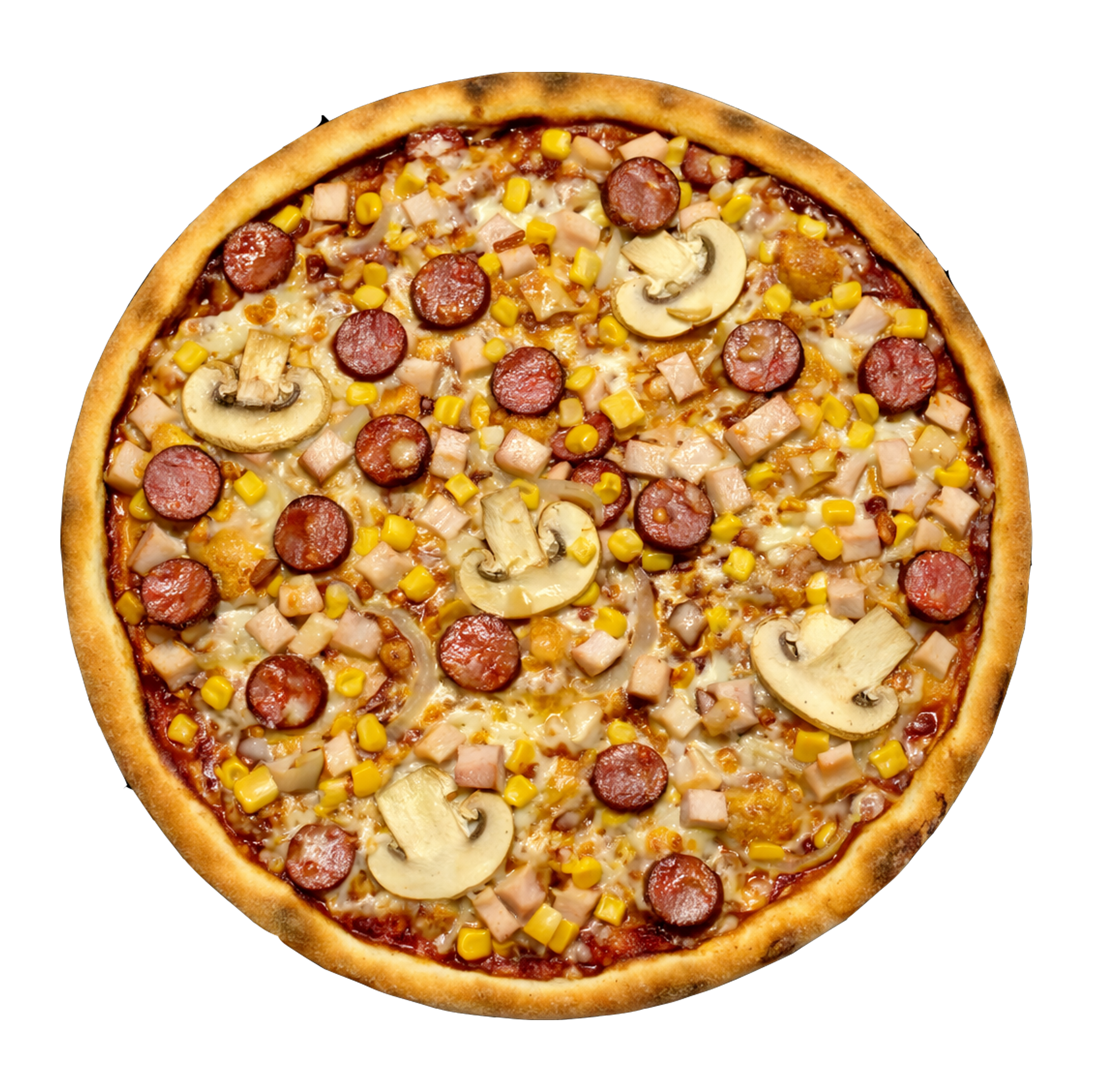 Соус барбекю, моцарела, печериці, копчена курка, кукурудза, мисливські ковбаски