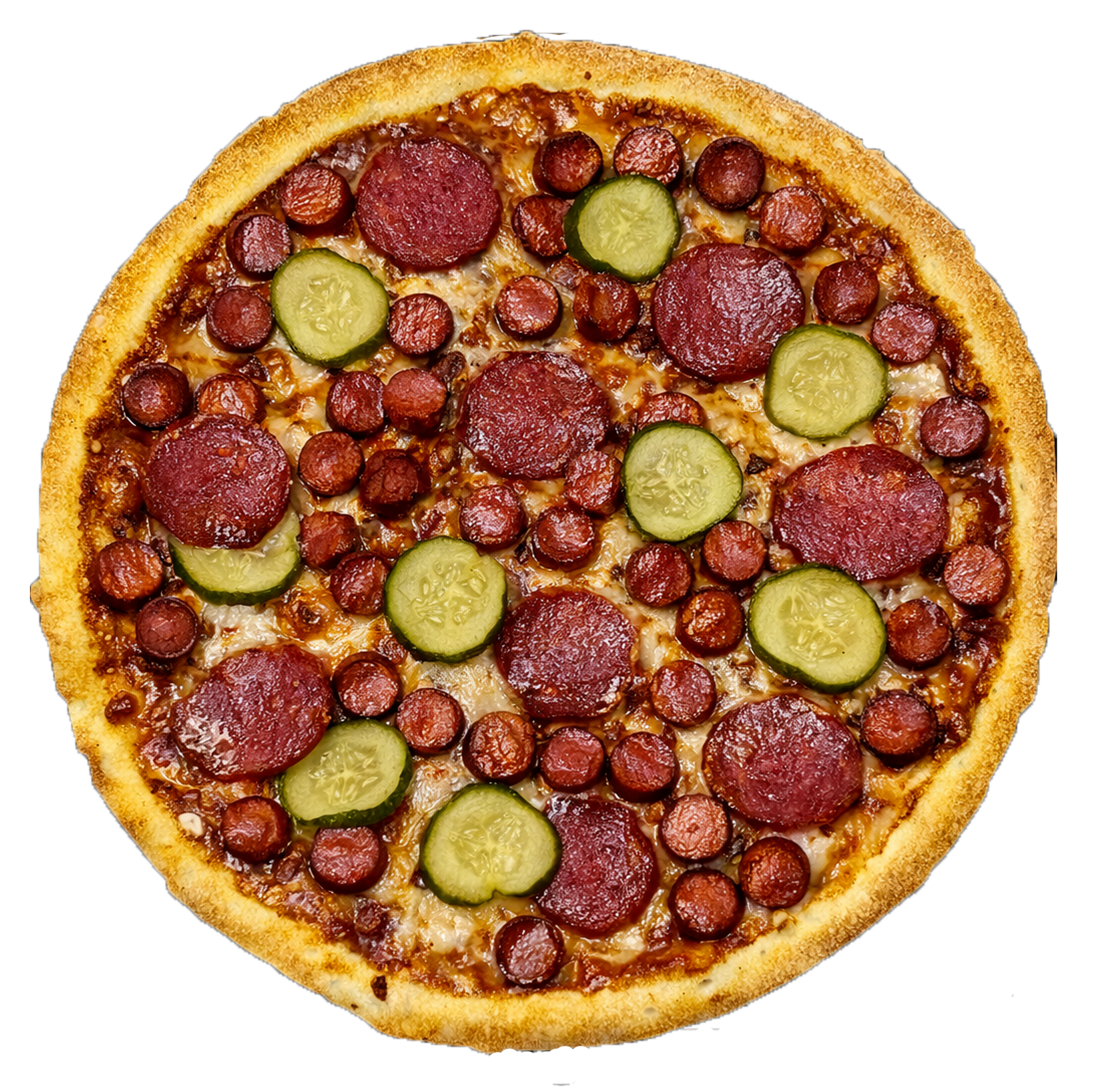 Соус барбекю, моцарела, салямі с/к, баварські ковбаски, солоний огірок