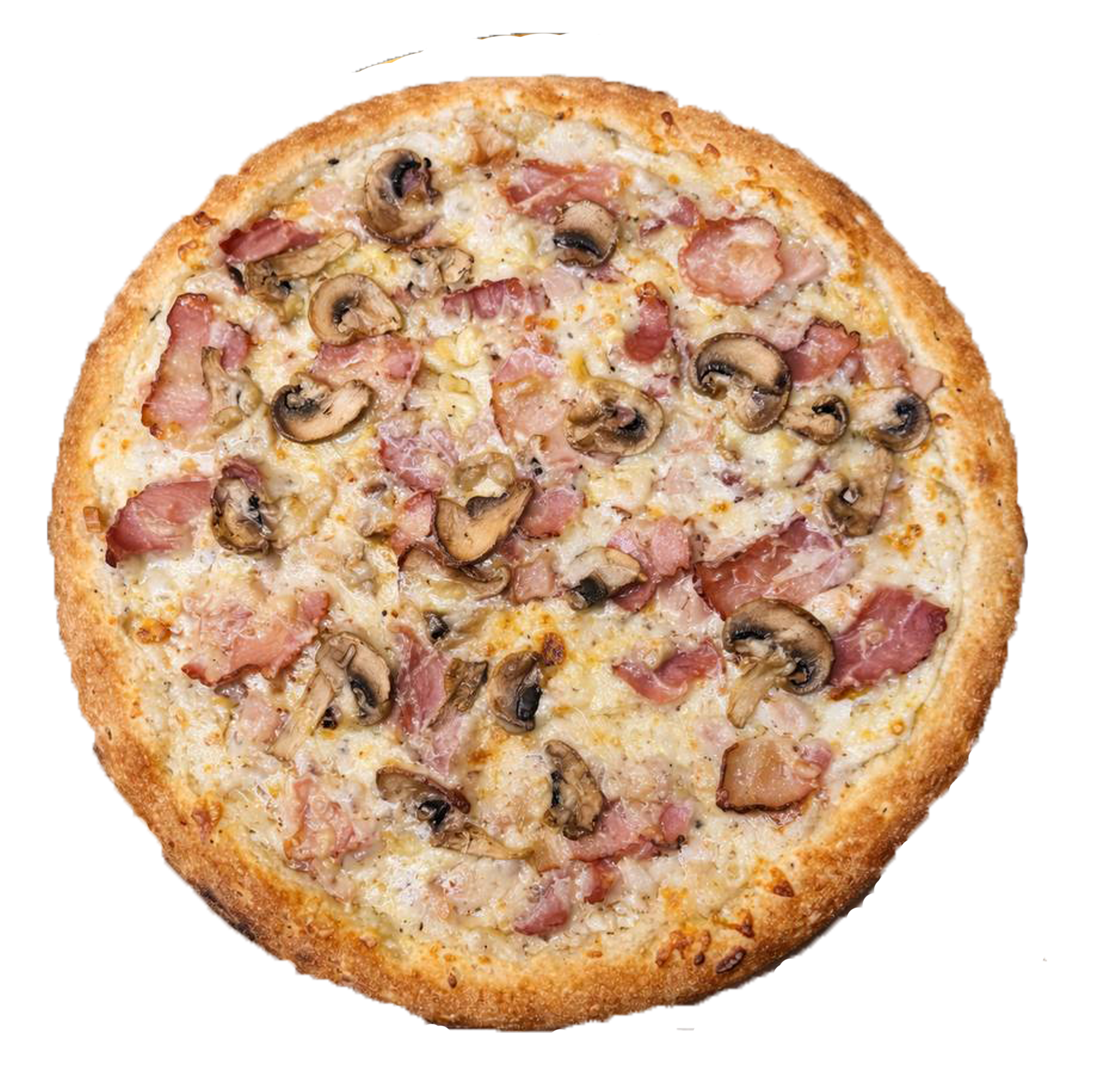 Соус вершковий, моцарела, курка, бекон, шинка, гриби, сир Гауда.