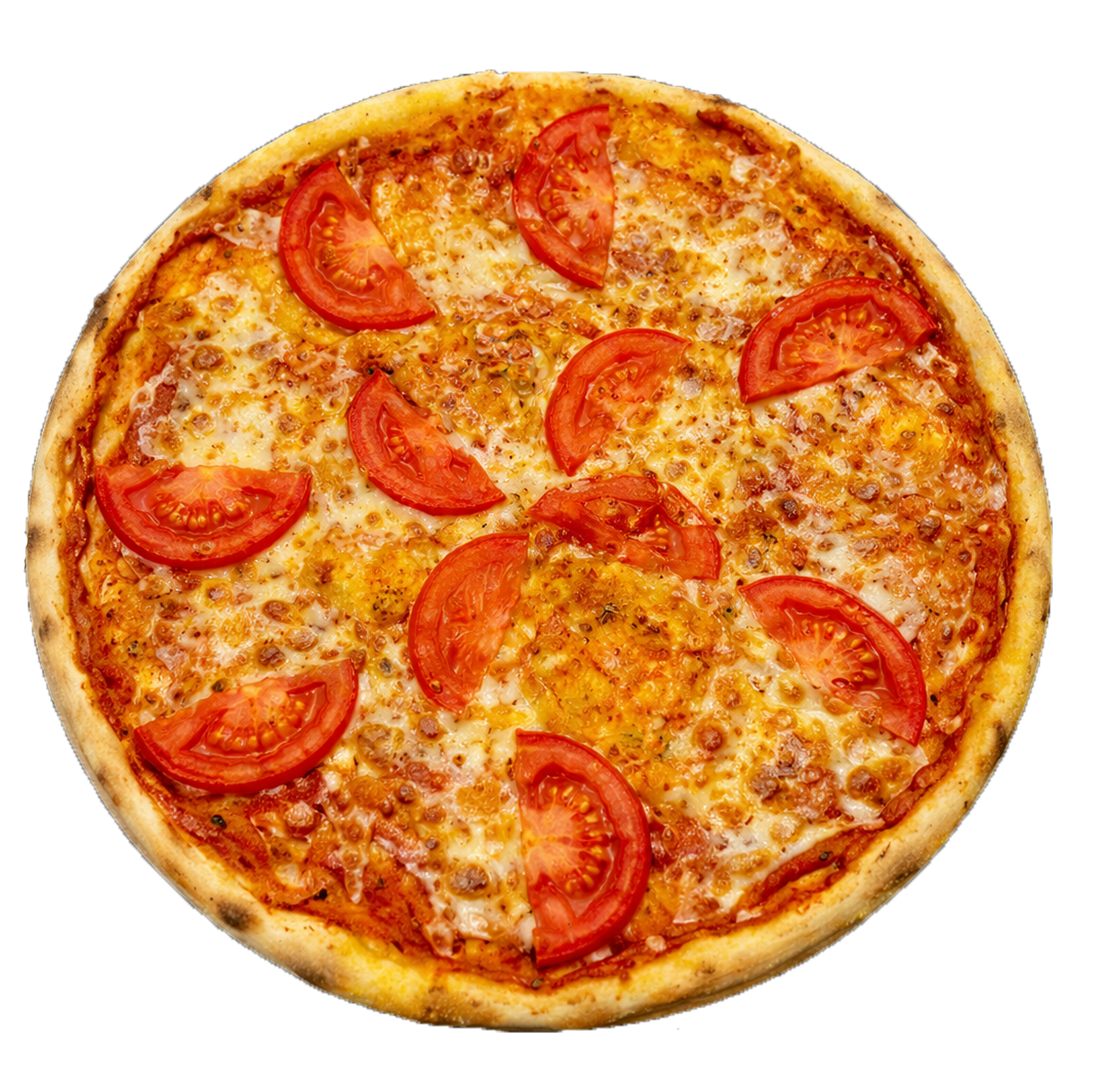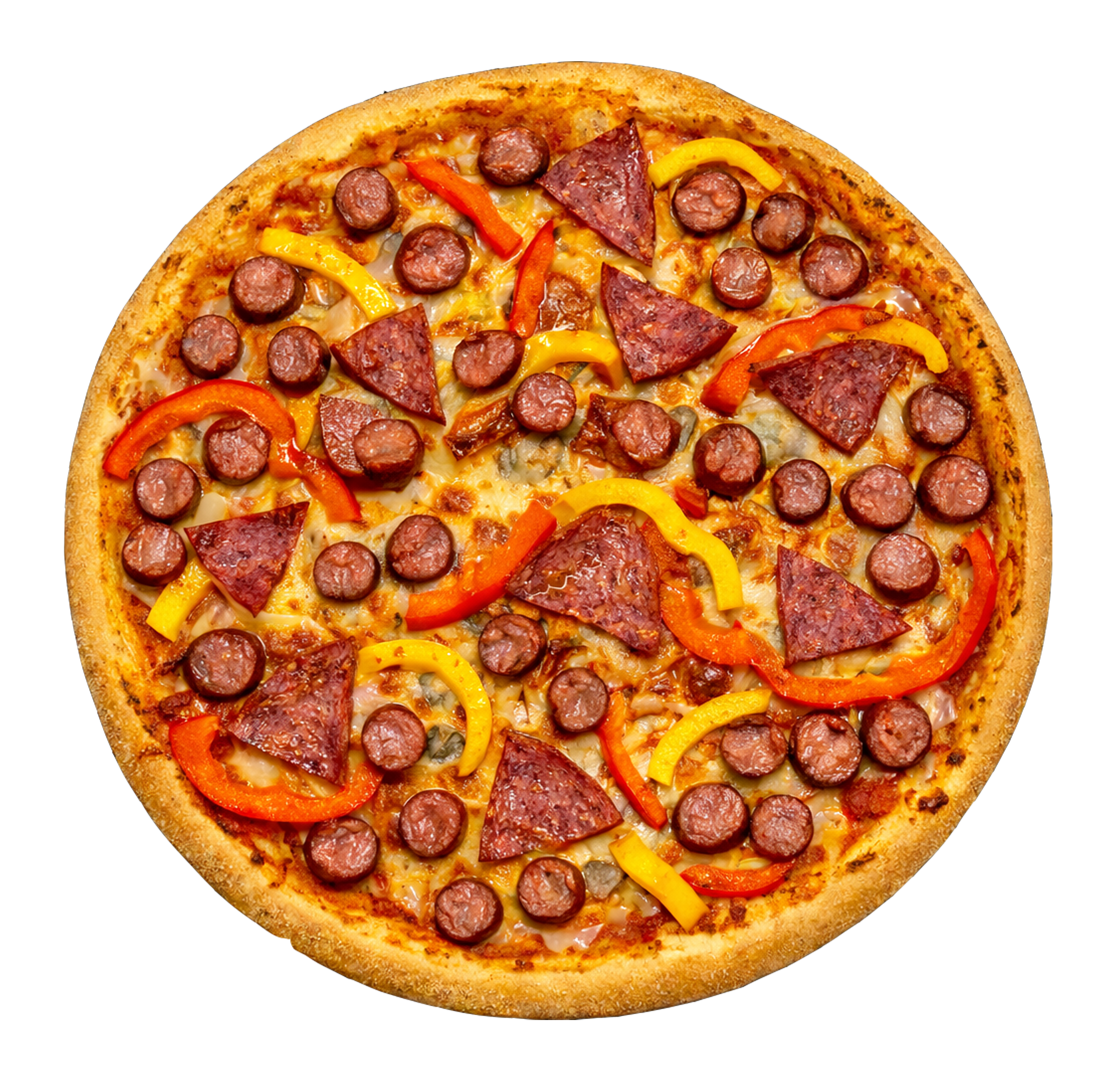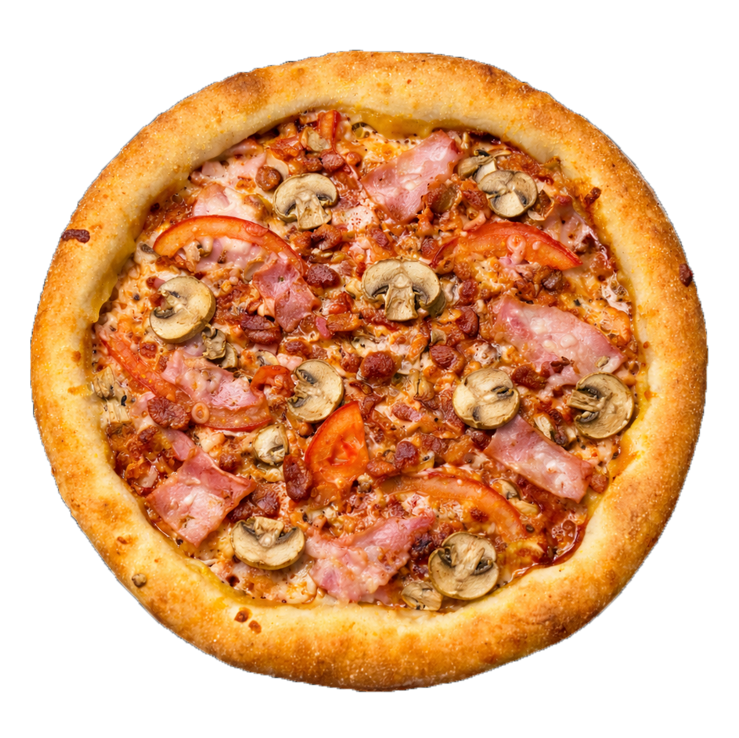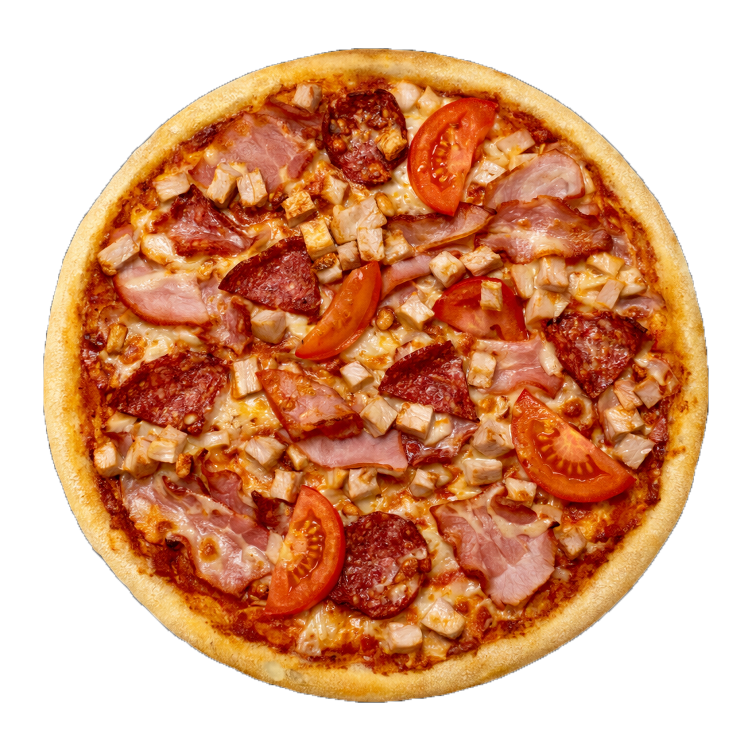 Соус томатний, моцарела, помідори, копчена курка, бекон, шинка, салямі