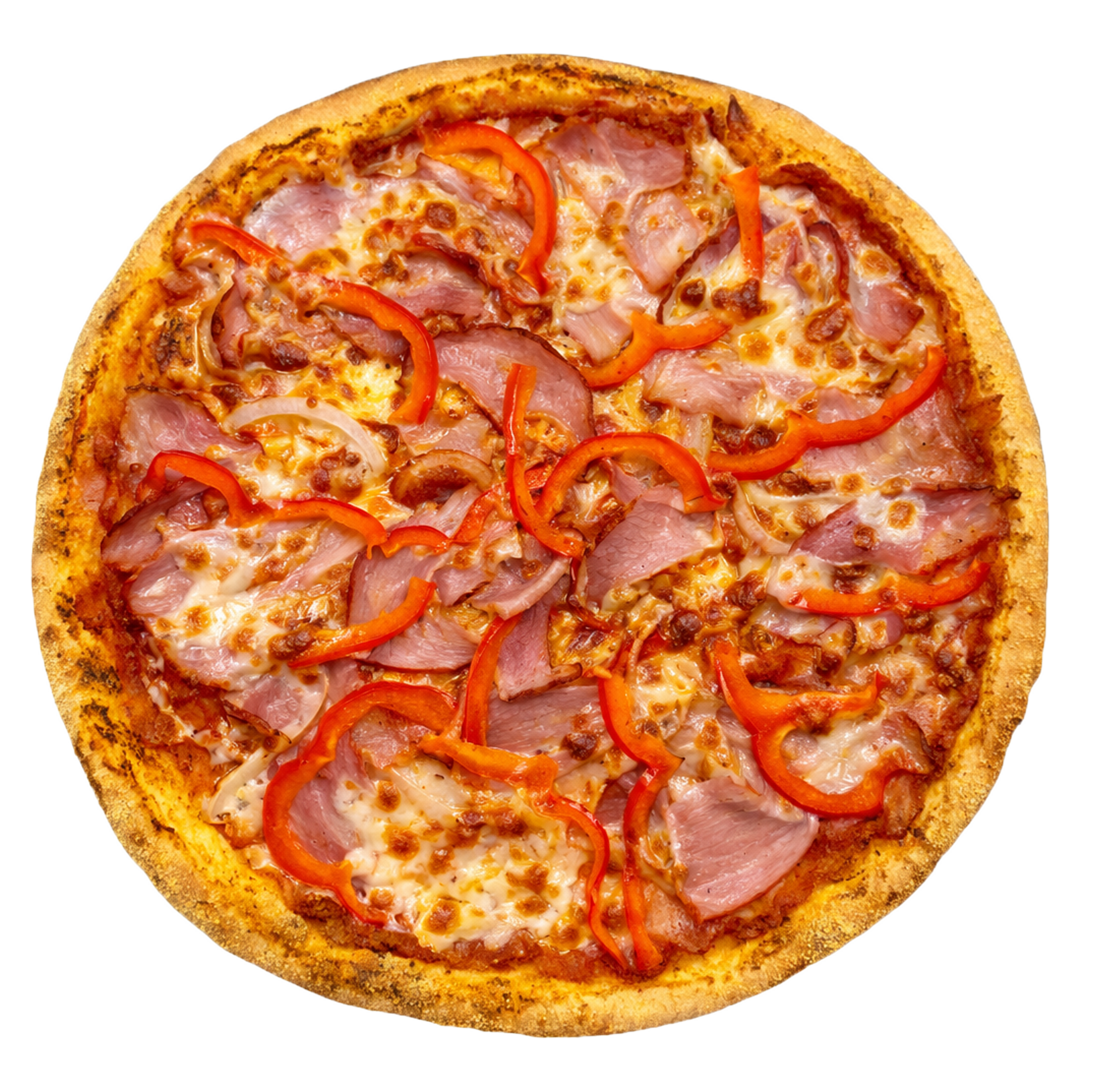 Соус томатний,моцарела,шинка, бекон, перець болгарський