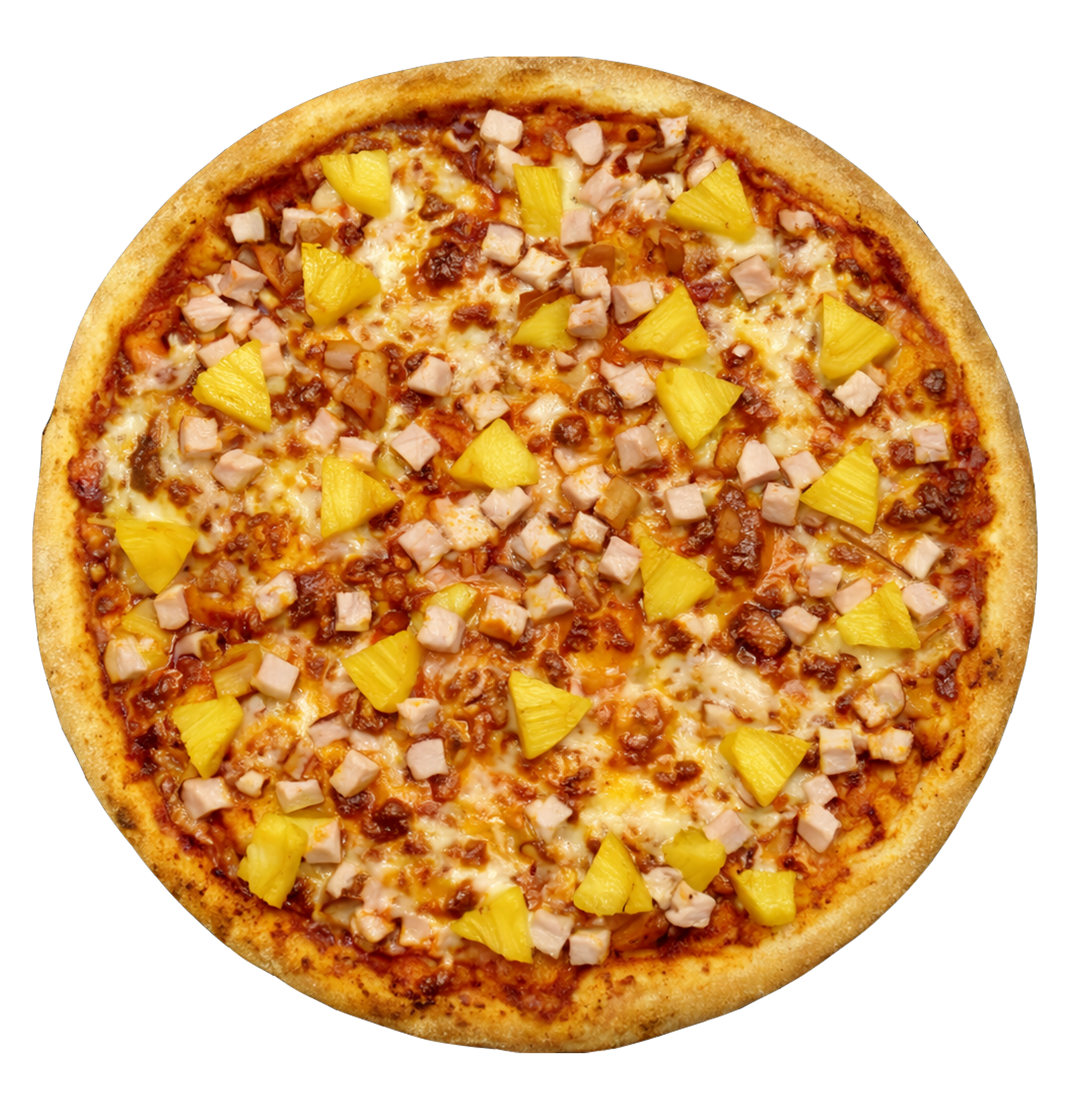 Соус томатний, моцарела, копчена курка, ананас