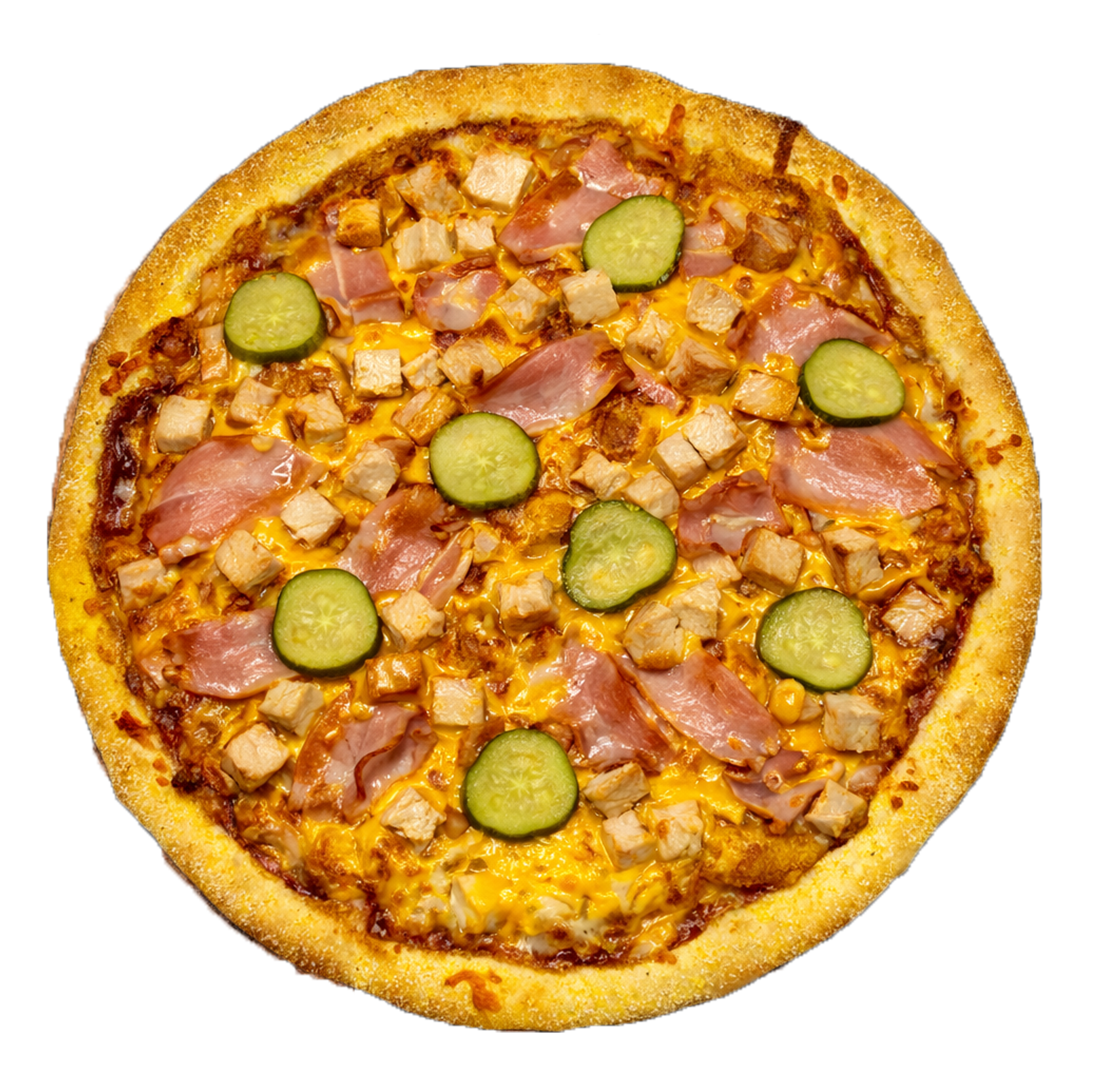 Соус барбекю, моцарела, сир Чеддер, копчена курка, шинка