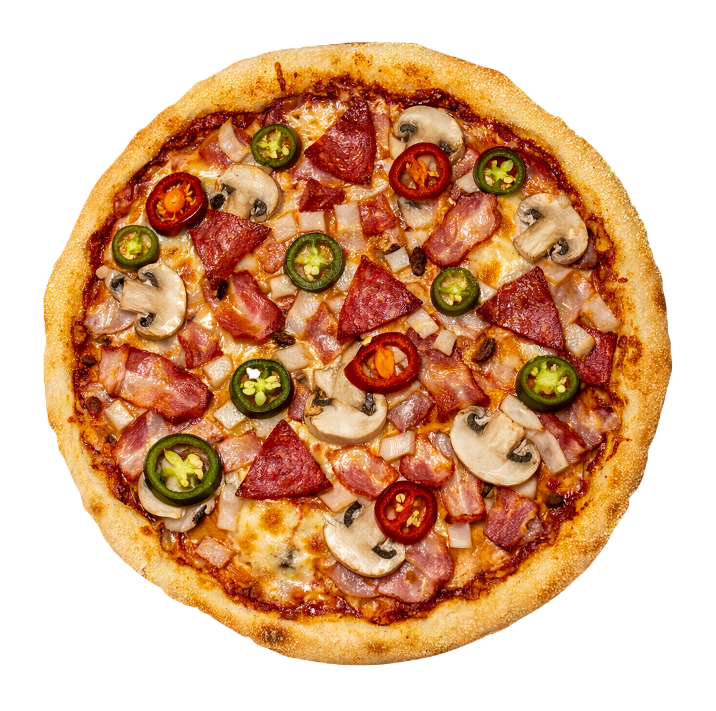Соус томатний гострий, моцарела, халапеньо,грудинка копчена, салямі, печериці